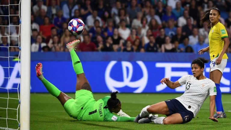On attendait et espérait un festival de beau football comme tant de France-Brésil nous en ont réservé chez les garçons (1958, 86, 98, 2006). On tomba de haut. Face à une Selaçao au complet et résolument offensive, les Bleues ne cessèrent de patiner dans la semoule. Ce sont elles pourtant qui obtiennent vite deux corners, mais à chaque fois la très solide Barbara s’impose, soit en captant, soit en bloquant (3’ et 5’). Le premier tir de la partie est pour Marta, des 18m, non cadrée (9’). Juste avant, Majri, puis Le Sommer sont venues s’empaler sur la défense brésilienne au lieu de passer le ballon (8’). Asseyi se bat (beaucoup défensivement), et Diani commence à faire parler sa puissance. Elle obtient un bon coup-franc à 30m dans l’axe après une belle percée. Henry le tire au dessus (11’)… Debinha répond par une frappe des 16m, Renard la contre, corner sur lequel s’impose Bouhaddi (15’)… Les Bleues pensent ouvrir le score au mitan de cette première période. Diani se joue de Tamires et adresse un centre aérien. Gauvin se jette, reprend de la tête, se heurte à Barbara et à Kathellen et le ballon file au fond. L’avant-centre du MHSC et la gardienne de Kindermann-Avai restent au sol, sonnées… L’arbitre doit consulter la VAR et décide d’annuler le but… alors que les ralentis montrent que le but aurait pu (dû ?) être accordé…