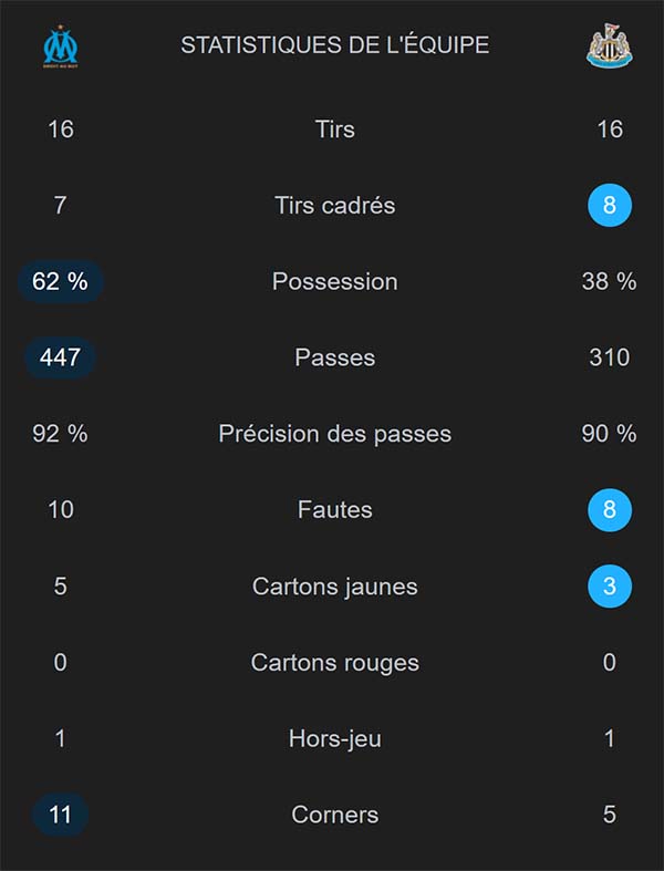 Soirée Aubameyang qui après avoir raté deux occasions en première période a marqué par deux fois au début de la seconde mi-temps. Victoire 2-1 contre Newcastle qui relance l’OM pour la qualification.