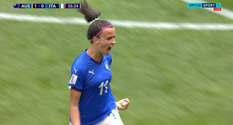 Retour gagnant pour l’Italie après exactement 20 ans d’absence en phase finale de CM. Face aux vice-championnes d’Asie, les Matildas australiennes, quart-finalistes des trois dernières éditions mondiales, les Transalpines ont sorti le match qu’il fallait. Pourtant, il sembla longtemps que le sort leur serait contraire. Il y eut d’abord un but refusé à l’attaquante et star de la Juventus Barbara Bonansea pour un hors-jeu de quelques centimètres (9’). Puis sa capitaine Sara Gama (par ailleurs auteure d’un gros match) ceinturait illicitement l’autre star du match, plus planétaire encore, Sam Kerr, offrant à celle-ci un pénalty (21’). L’attaquante des Chicago Red Stars se faisait justice, mais voyait d’abord sa frappe repoussée par Giuliani, avant de pouvoir reprendre et marquer… L’Australie dominait ensuite le reste de cette première période très vivante et terminée sur ce score de 1-0…