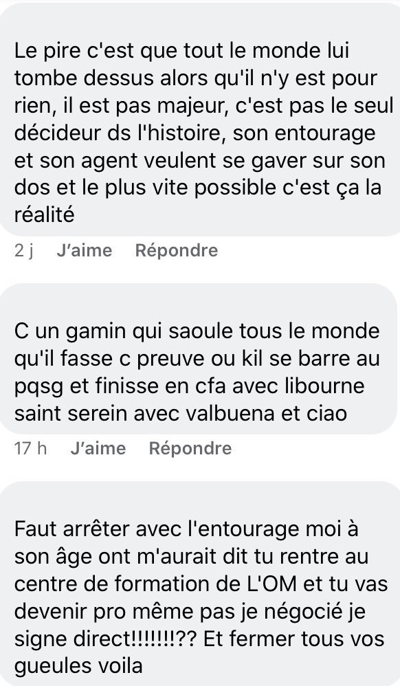 Depuis les révélations de La Provence il y a deux jours, concernant un accord qui serait en passe d’être trouvé sur les bases d’un salaire avoisinant les 40 000 euros et une prime à la signature dépassant le million d’euros – assez étrangement le quotidien régional ne connaît pas la durée du contrat éventuel – puis sur les questions que se poseraient l’entourage du joueur sur le judicieux de signer à Marseille, les commentaires se sont déchaînés sur les réseaux sociaux. Notamment les commentaires haineux comme ceux-ci :