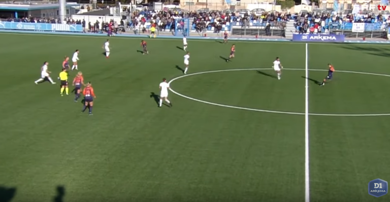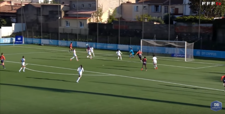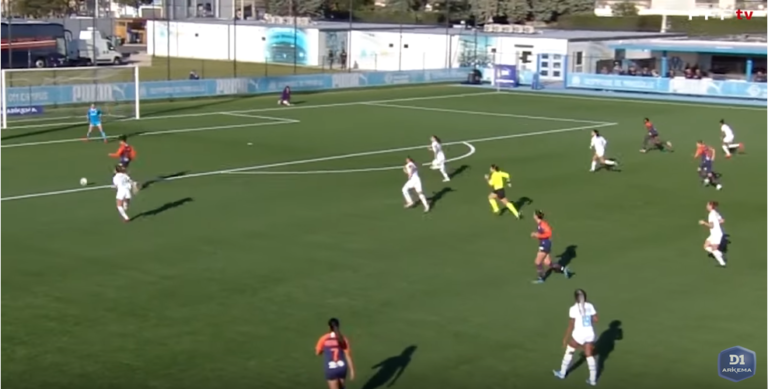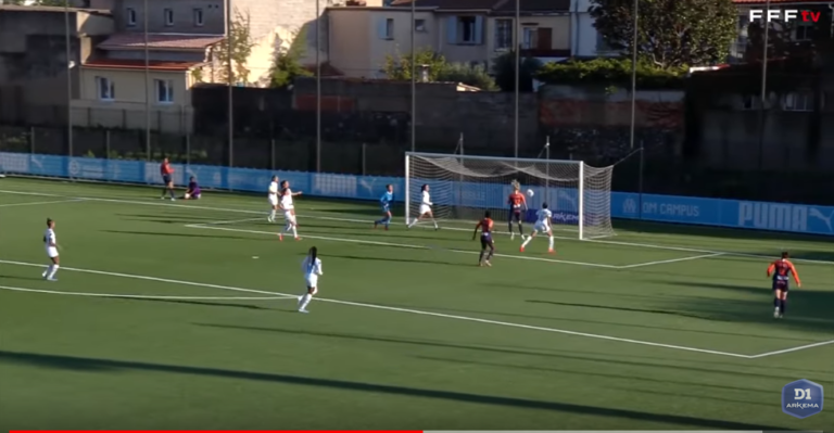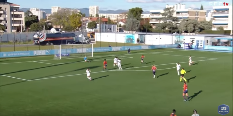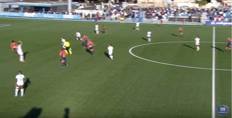 L’Autrichienne du MHSC Sarah Puntingam a le ballon dans le rond central. Outre les 5 Montpelliéraines visibles dans le camp olympien, il faut ajouter Valérie Gauvin hors champ à gauche. 7 Olympiennes sont visibles, plus Maud Antoine, elle aussi hors champ à gauche, au marquage de Gauvin (la vidéo ne permet pas de les voir au départ de l’action). On remarque les trois milieux de terrain olympiennes ne servant à rien, ne marquant personne. Du coup, si l’on compte bien, nous avons 5 attaquantes du MHSC (les 4 visibles + Gauvin) pour 4 Marseillaises.