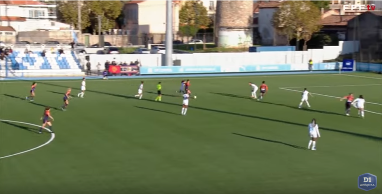 Sur son simple contrôle en pivot, la joueuse du MHSC élimine Tess Laplacette. Devant elle, Antoine est au marquage de Gauvin qui, pour ne pas changer (pourquoi changer ?), part dans son dos, anticipant l’ouverture en profondeur de sa coéquipière.