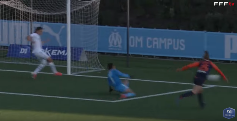 Heureusement pour l’OM, Gauvin ripe sa reprise qui va dans les gants de Joly. À noter que si la gardienne avait repoussé le ballon sur sa gauche, une deuxième Montpelliéraine était absolument seule face au but vide, lâchée à son tour au marquage par Pizzala, obligée de venir compenser sur Gauvin la défection d’Antoine…