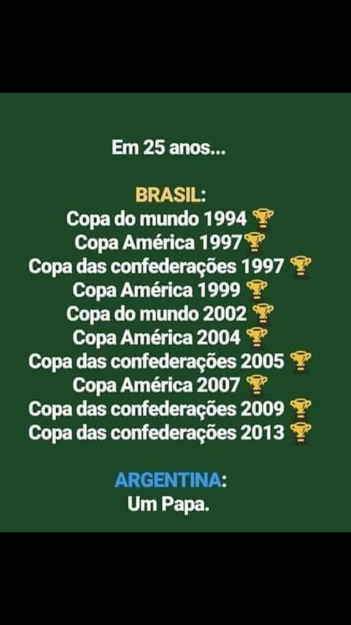 Quant au palmarès depuis 25 ans certes, même depuis 100 ans. Par contre, j'aurais mentionné les deux victoires aux JO de l'Argentine en 2004 et 2008. Même si c'est maigre.