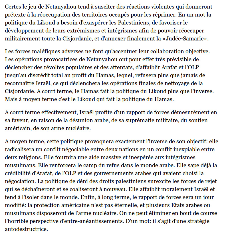 (objectifs de toute façon parfaitement irréalistes) règleraient le problème israélo-palestinien. C'est une opinion qui me semble pouvoir se défendre.
