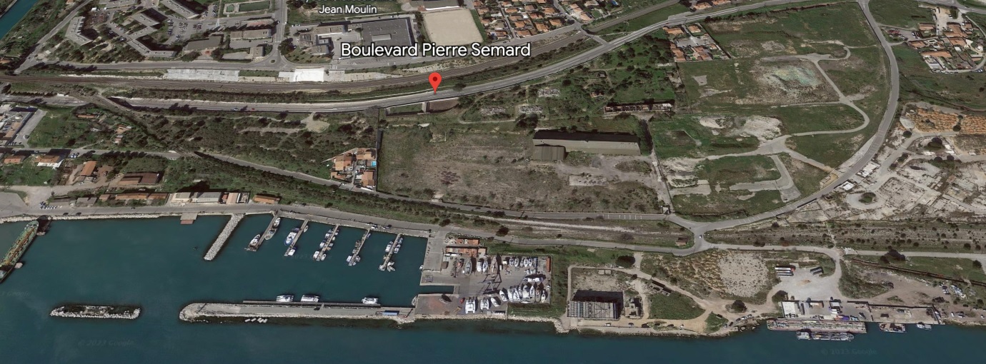 J'ai lancé Google Earth qui au premier abord donne une image plutôt flatteuse du site, avec le terrain juste aux pieds du port de plaisance, comme sur les photos de la plaquette: