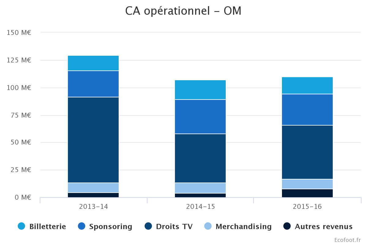 Comment l’OM a-t-il pu connaître une amélioration de son résultat d’exercice alors que le club a connu une saison 2015-16 très difficile sur le plan sportif ? Pour rééquilibrer ses comptes, le club s’est appuyé sur deux axes majeurs. Tout d’abord, malgré la saison difficile vécue sur le plan sportif, l’OM a tout de même affiché une progression de ses revenus opérationnels. Ces derniers ont enregistré une hausse de près de 3% par rapport à l’exercice 2014-15 pour franchir à nouveau le seuil des 110 M€.
