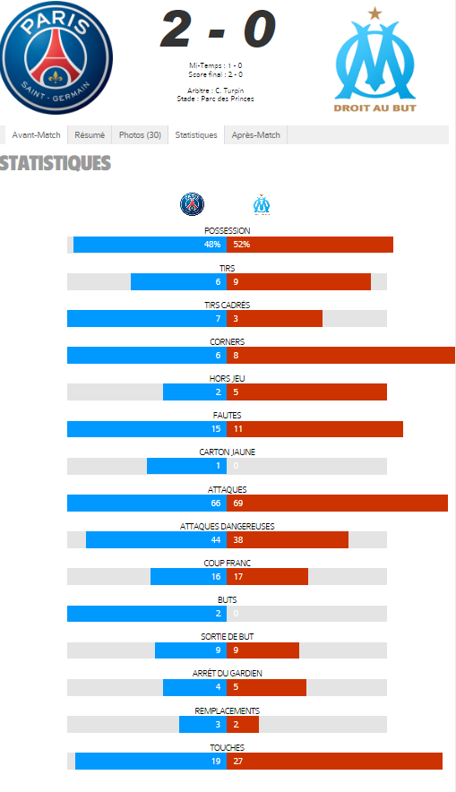 Par contre je comprends pas l'analyse qu'on voit un peu partout disant que Paris a dominé le match. Les premieres 20 minutes étaient pour nous, les dernieres pour Paris (consécutif à l'expulsion) mais entre les deux c'était très équilibré comme le montrent les stats d'ailleurs.