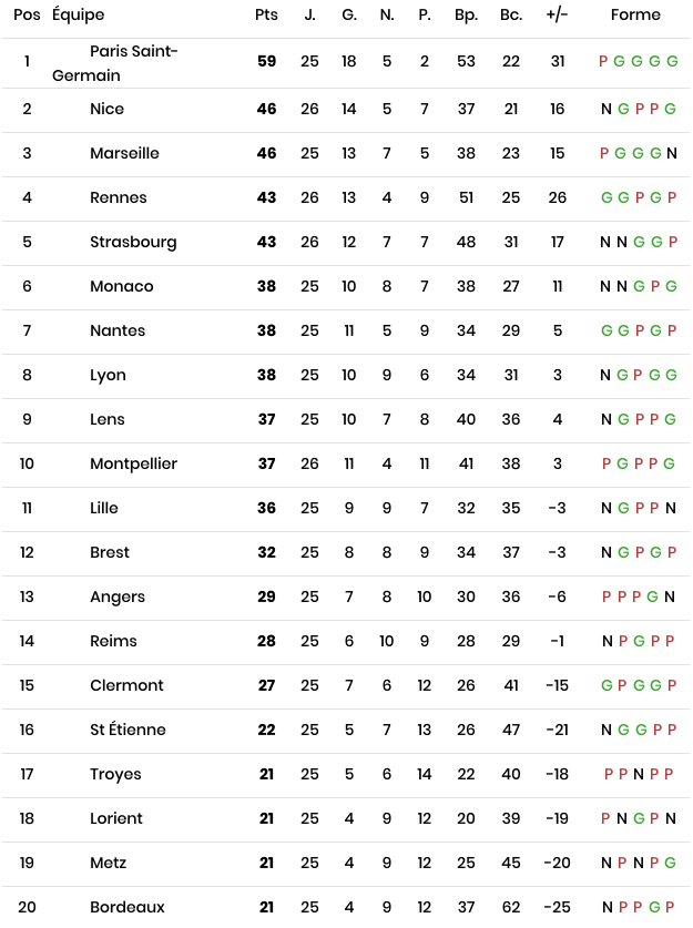 Classement de L1 avant le match
