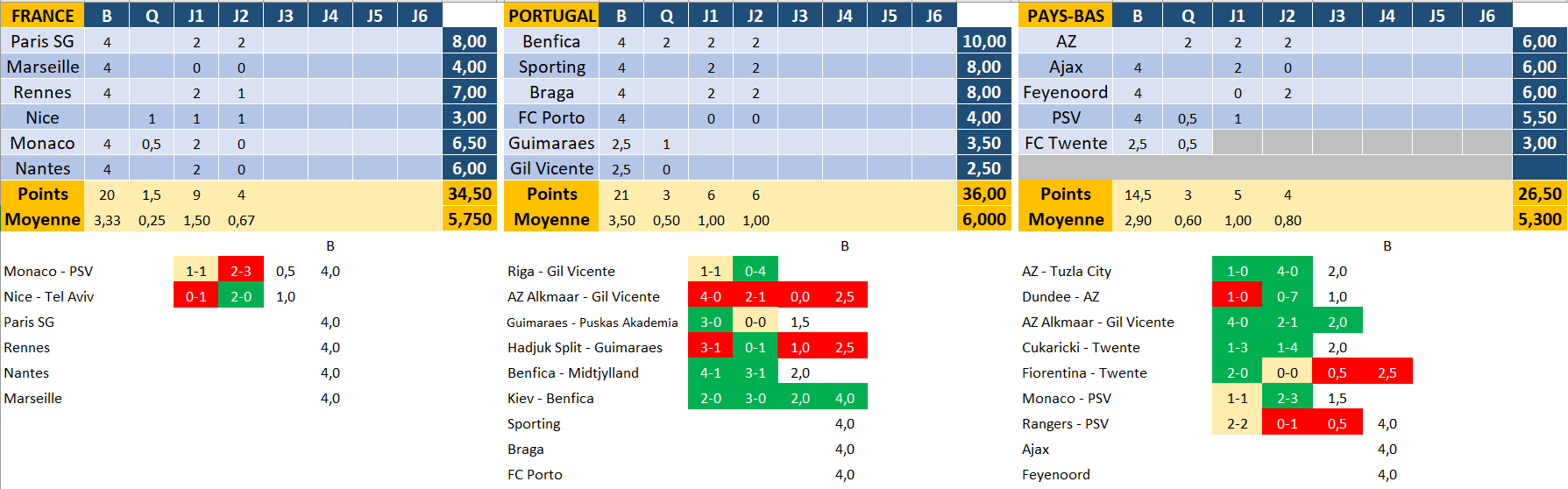 - Les équipes qui atteignent la phase de groupe en LDC et en Europa obtiennent 4 pts pour leur participation, donc 4pts à PSG, OM, Monaco, Nantes, Rennes, Benfica, Porto, Sporting, Ajax, PSV et Feyenoord.