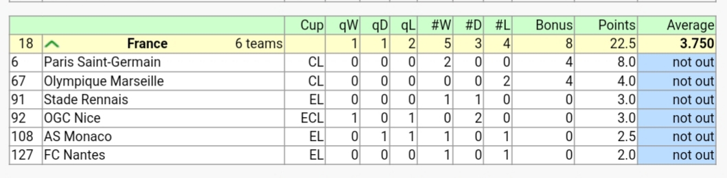 En essayant de reconstituer les points de la France l'année dernière, j'arrive au bon total mais sans les points de la phase de groupe UEFA. J'ai donc été recherché les points de chaque club français dans le classement UEFA sur la saison 21-22 (PSG, Lille, Monaco, Lyon, OM, Rennes),