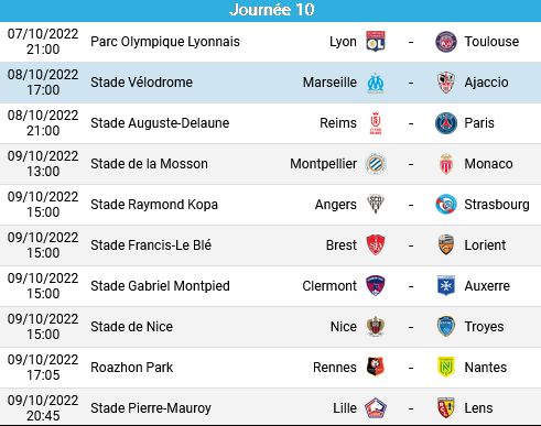 Calendrier de la 10ème journée de L1