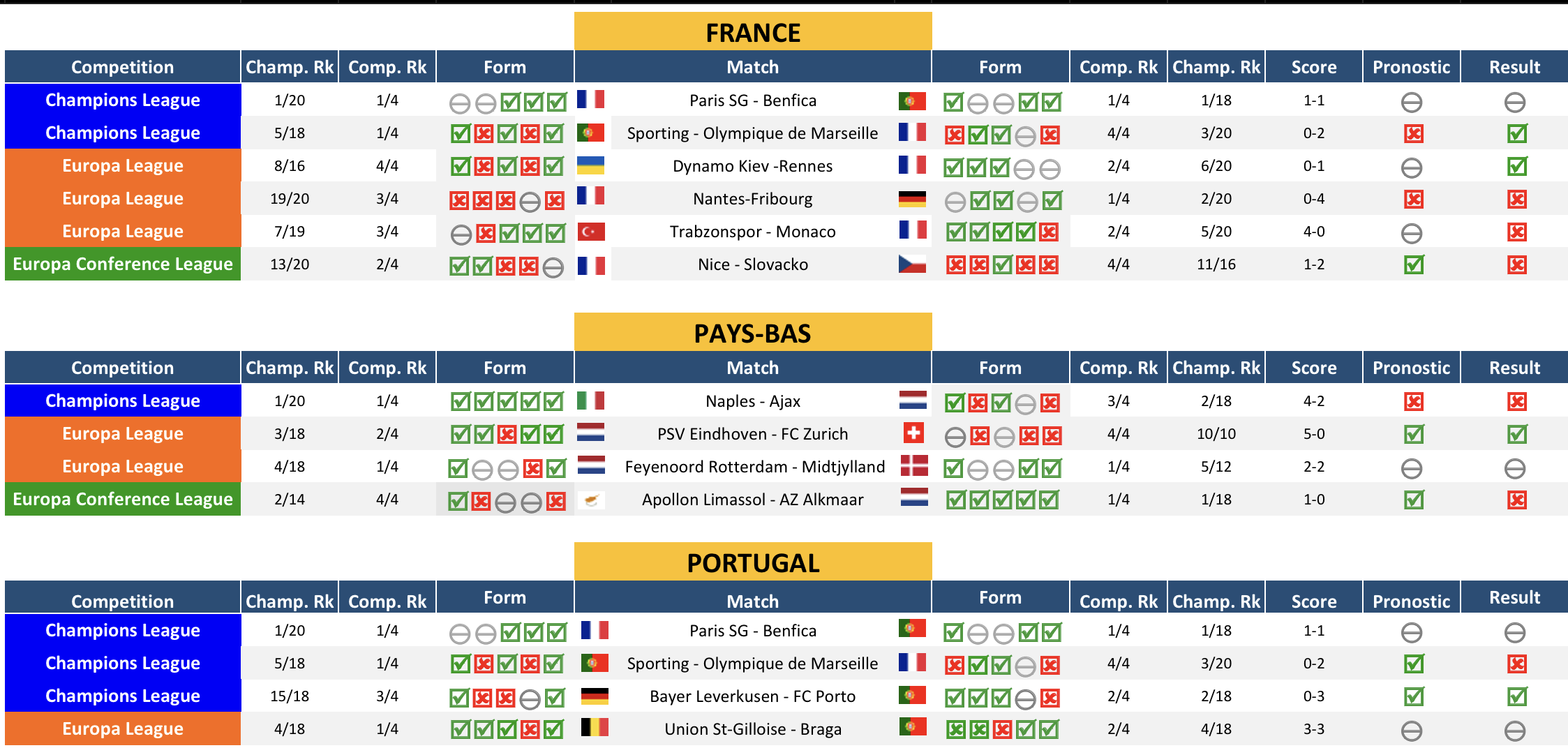 - Côté P-B, je mise sur le reversement de l'Ajax en EL et de Feyenoord en Conference malgré une victoire contre la Lazio. A noter qu'ils peuvent encore tout perdre, mais je ne les vois pas contre-performer dans leur antre. PSV et AZ deja qualifiés.