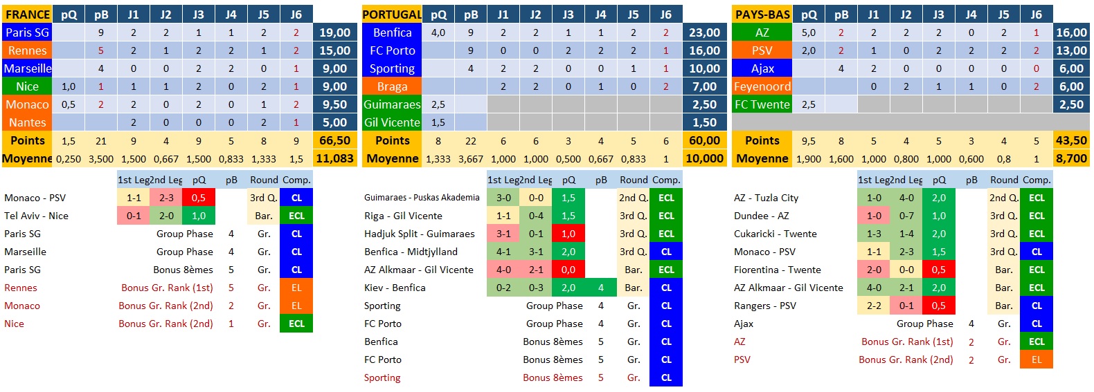 A noter que ce n'est pas le classement officiel puisque l'on ne connait pas encore le classement final de Rennes, AZ Alkmaar et PSV, ce qui peut jouer sur le point de bonus obtenu à l'issue de la phase de groupes. Dans mon tableau je leur ai attribué le bonus minimal en lien avec leur moins bon classement théorique.
