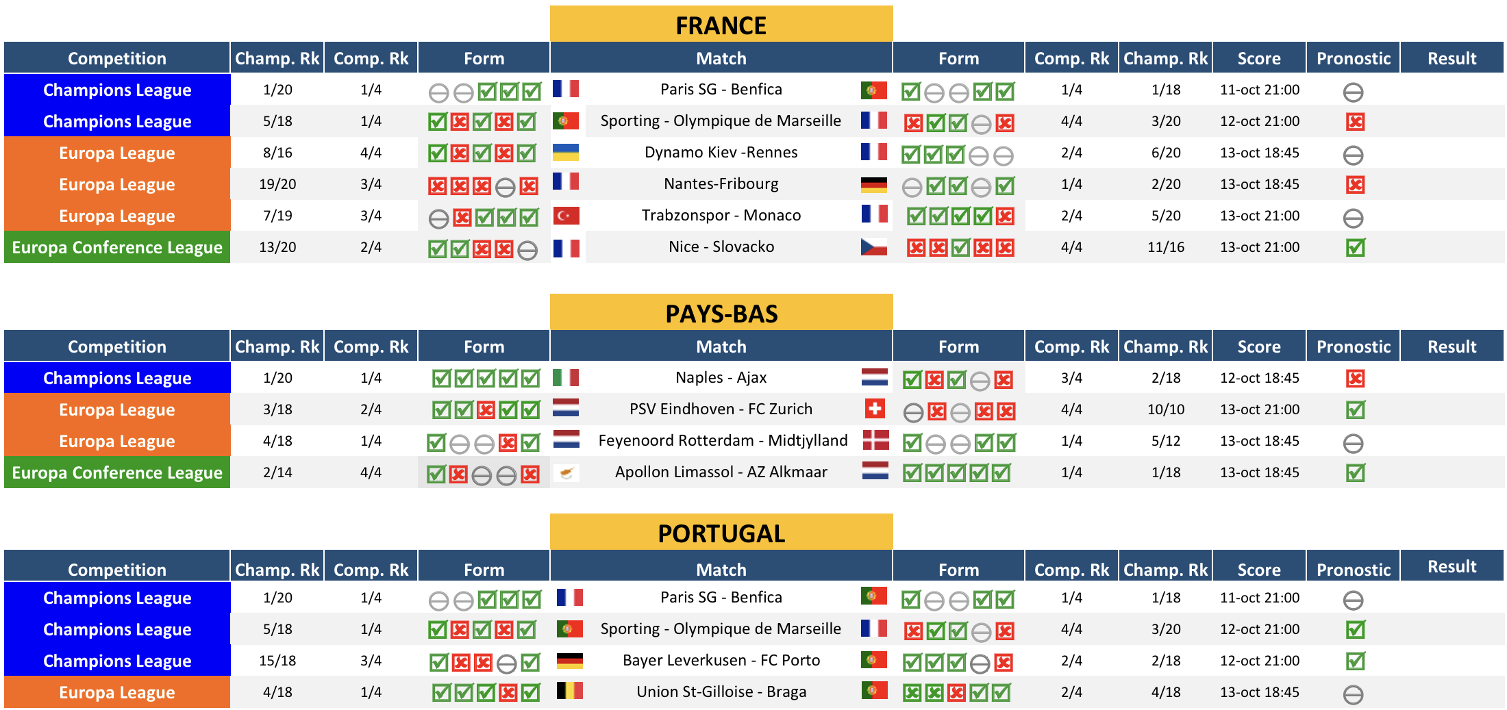 - Comme l'année dernière, le Portugal a perdu 2 clubs en qualifications d'ECL et en plus très tôt, minimisant leur nombre de points de qualification. Le Portugal n'a donc pas pris la même avance que l'année dernière. Comme l'année dernière, ce sera très préjudiciable pour eux, et devrait les handicaper toute la saison. Quand ils dévissent sur une journée comme cette semaine, ils marquent 3 pts (0,5) quand la France en marque 4 (0,67) et cela risque de leur arriver plus souvent que la France.