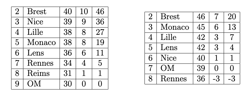 ), on revient à 3 points de Lille 4ème (Barrages UCL) qui a la mm diff. de buts que nous, d'ailleurs seul Brest (sur qui on reprend 3 points) a une meilleure diff. de buts avec nous de tout le tableau.
