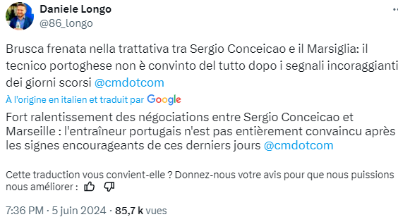 L’OM espère un dénouement cette semaine. La balle est dans le camp de Conceiçao, estime-t-on au sein du club marseillais, qui a mis tous les arguments sur la table pour essayer de le convaincre, même si l’OM a toujours eu en tête qu’il s’agissait d’un dossier difficile, d’autant plus sans qualification européenne.