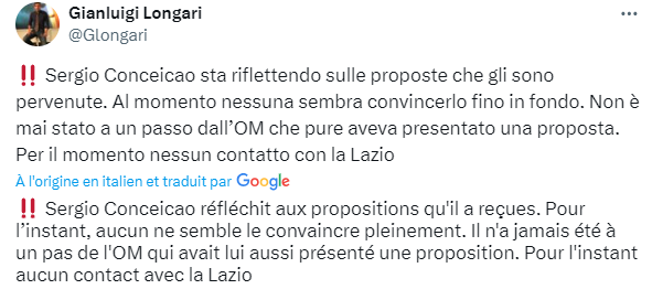 Depuis quelques jours, le club olympien a fait de Conceiçao sa priorité, mais l’OM commence à trouver le temps long. Conceiçao est en pleine réflexion, voire en pleine hésitation, à tel point que l’OM aurait du mal à y voir clair.