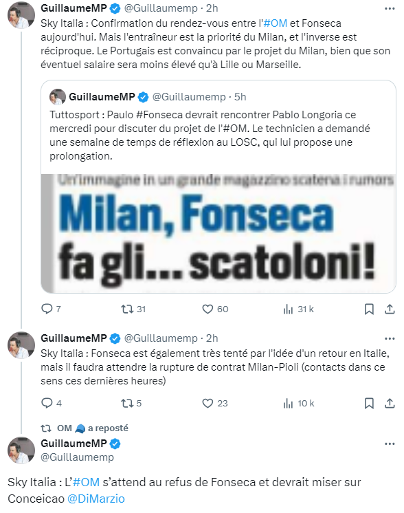 Ce n'est plus un secret : la priorité du président marseillais s'appelle Paulo Fonseca, déjà approché l'été dernier mais cette fois arrivé en fin de contrat avec Lille. Le problème, c'est que le Portugais a d'autres courtisans et l'ambition de jouer une Coupe d'Europe. Le Milan est le plus avancé mais rien n'est décidé encore, parce que le club lombard est traversé par différents courants, dont l'un est incarné par Zlatan Ibrahimovic, qui préférerait Mark Van Bommel.