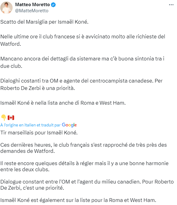 En effet, selon nos informations, les pensionnaires de l’Orange Vélodrome ont trouvé un accord total avec Watford pour la signature d’Ismaël Koné. Le milieu de terrain de 22 ans, actuellement aux États-Unis pour disputer la Copa América avec le Canada, s’est également mis d’accord sur le contrat qui le liera pour plusieurs années à l’Olympique de Marseille. Un coup de maître de la part de la direction marseillaise qui faisait face à la concurrence de plusieurs formations européennes qui souhaitaient mettre la main sur le natif d’Abidjan. Selon nos indiscrétions, ce dernier a même refusé des offres plus onéreuses de la Roma et de West Ham pour rallier la Canebière. Pour mener à bien ce dossier, les dirigeants marseillais ont fait preuve de beaucoup d’ingéniosité pour passer devant une concurrence plus armée financièrement.