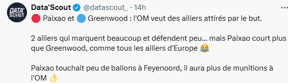 Maintenant objectivement, je trouve le profil du joueur intéressant. Il a un coté en effet très Greenwood. Il se met vite dans le sens du but et si il a le ballon à 20 mètres, il peut envoyer un bon cachou ou enrouler son ballon. Il déborde aussi coté gauche. Très explosif sur les premiers appuis, ce qui est intéressant face aux blocs bas. Il épouse assez bien la devise du club comme Greenwood d'ailleurs.