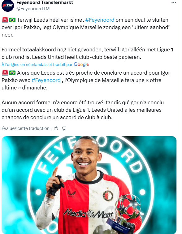 L’avenir d’Igor Paixão semble se dessiner loin du stade De Kuip. Leeds United est sur le point de conclure un accord avec Feyenoord pour le transfert du Brésilien, mais l’Olympique de Marseille tente de le détourner à la dernière minute. Le club du sud de la France travaillerait actuellement sur une offre finale destinée à convaincre toutes les parties.