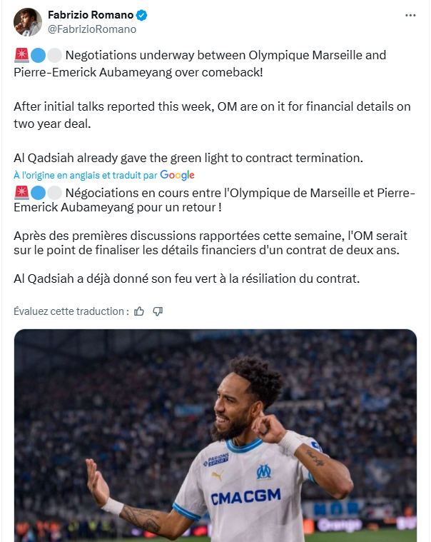 Et selon nos informations, les discussions avancent très bien. En effet, les négociations vont dans le bon sens pour un accord contractuel autour d’un bail de 2 saisons. Affaire à suivre mais un retour romantique de l’international gabonais au Vélodrome est plus que jamais d’actualité pour le plus grand plaisir des supporters marseillais. Néanmoins, pour le moment, l’OM comme tous les clubs intéressés doivent attendre qu’Aubameyang résilie son bail en Arabie saoudite, puisqu’il est toujours officiellement sous contrat. Une fois son bail résilié, tous auront le champ libre pour attaquer. Si rien n’est encore officiellement acté, l’hypothèse d’un retour de Pierre-Emerick Aubameyang à l’OM prend chaque jour un peu plus de consistance. Au-delà de l’aspect purement sportif, où son profil et son expérience constitueraient un renfort de poids pour le secteur offensif marseillais, c’est tout un symbole qui pourrait renaître sous les projecteurs du Vélodrome.