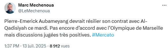 Auteur d’une saison remarquée sous les couleurs olympiennes, l’attaquant gabonais a su nouer une relation sincère avec le public phocéen, entre performances, charisme et gratitude. Son message d’adieu, empreint d’émotion et de reconnaissance, avait laissé la porte entrouverte à un futur retour. Aujourd’hui, les planètes semblent s’aligner pour que ce scénario se concrétise. Si l’aspect contractuel avec Al-Qadsiah reste à régler, les discussions avec l’OM sont déjà bien avancées et témoignent de la volonté partagée de renouer cette histoire. Dans un mercato souvent rythmé par des choix froidement stratégiques, cette perspective a quelque chose de profondément humain, presque romantique : celle d’un joueur qui retrouve un club où il s’est senti chez lui, pour tenter de faire vibrer à nouveau tout un peuple. L’OM, en quête de repères et de leaders, pourrait bien faire un coup magistral en ranimant la flamme Aubameyang. Les prochaines heures s’annoncent mouvementées.