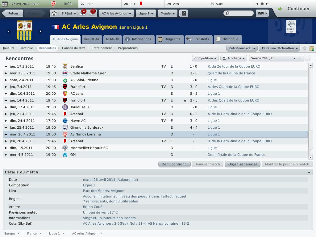 Dans ma partie avec Arles, la deuxieme saison, je joue le 24 contre le Havre, le 25 contre Bordeaux, le 26 contre Nancy, et le 28 contre Arsenal en europa league, et le 1er contre Montpellier... 5 matchs en 1 semaine, chargé on va dire :mrgreen: