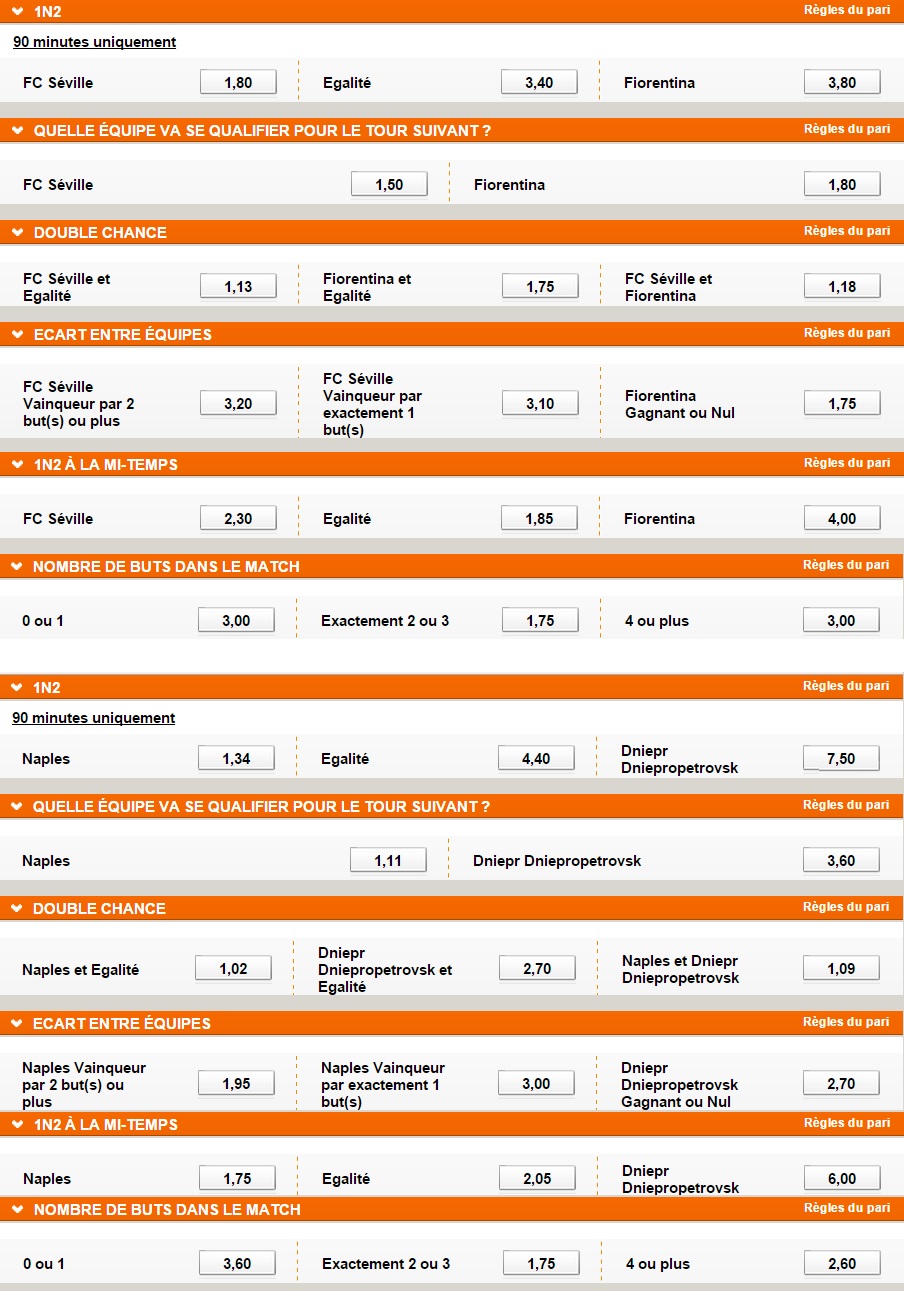 2,50 sur Séville vainqueur par un but d'écart et 2,50 sur Naples vainqueur